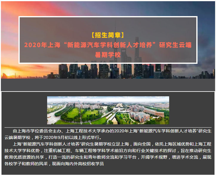 暑期以來,機械與汽車工程學院組建研究生暑期學校籌備工作小組,積極推進2020年上海“新能源汽車學科創新人才培養”研究生云端暑期學校籌備工作。假期間,暑期學校籌備工作小組成員犧牲休息時間,多次加班召開線上或線下會議,謀劃組織開展學員招募、專家邀請、對外宣傳、學術論壇等一系列準備工作,并定于2020年9月1日—10日以線上形式舉行。