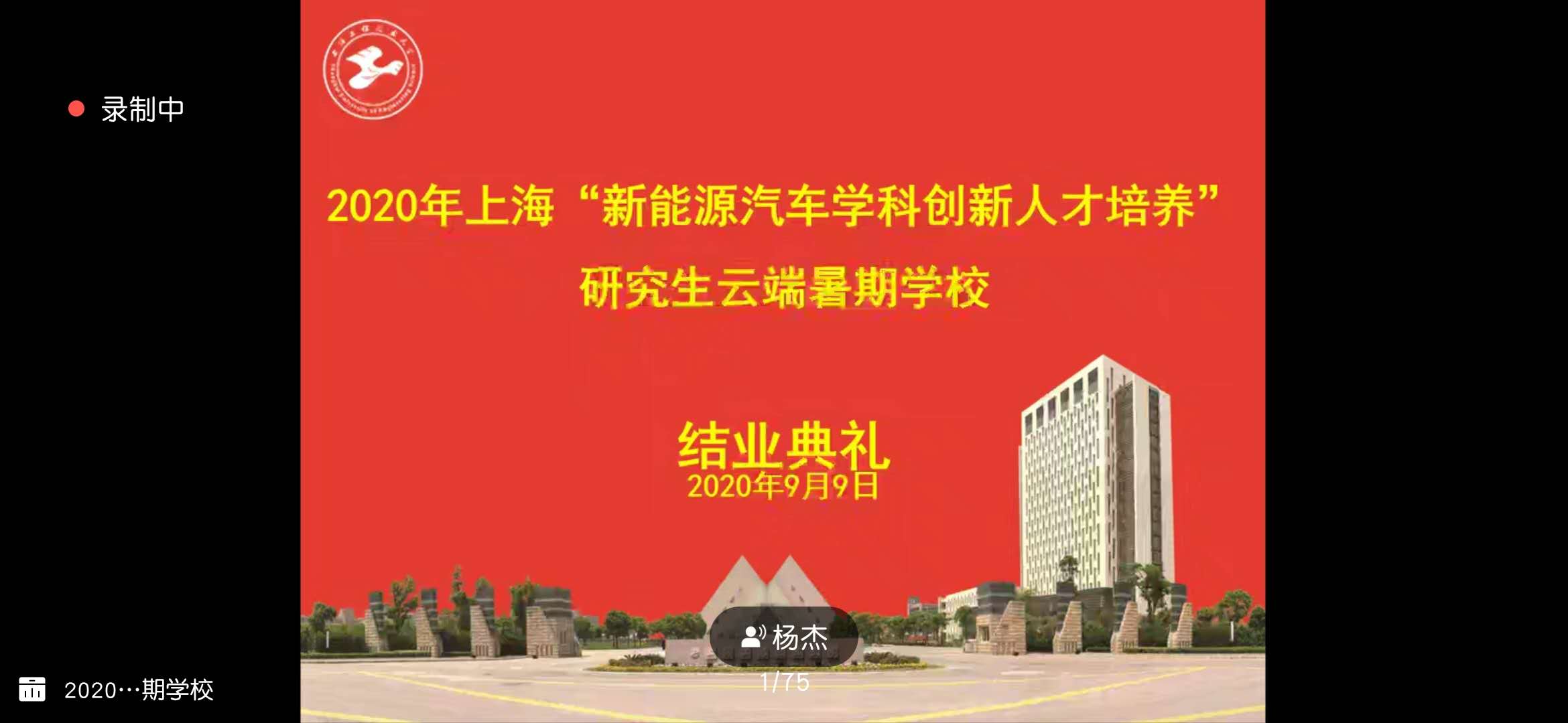 2020年9月9日下午,由上海市學位委員會主辦,上海工程技術大學承辦的2020年上海“新能源汽車學科創新人才培養”研究生云端暑期學校結業典禮在華為云會議平臺直播上如期舉行。機械與汽車工程學院副院長崔國華教授、暑期學校全體師生、志愿者共250余人參加結業式。結業典禮由暑期學校教師志愿者、機械與汽車工程學院青年教師楊杰博士主持。