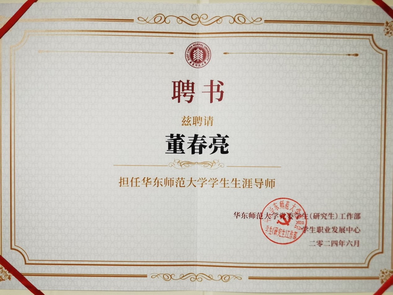 會上,主辦方為董春亮老師頒發了華東師范大學學生生涯導師聘書。