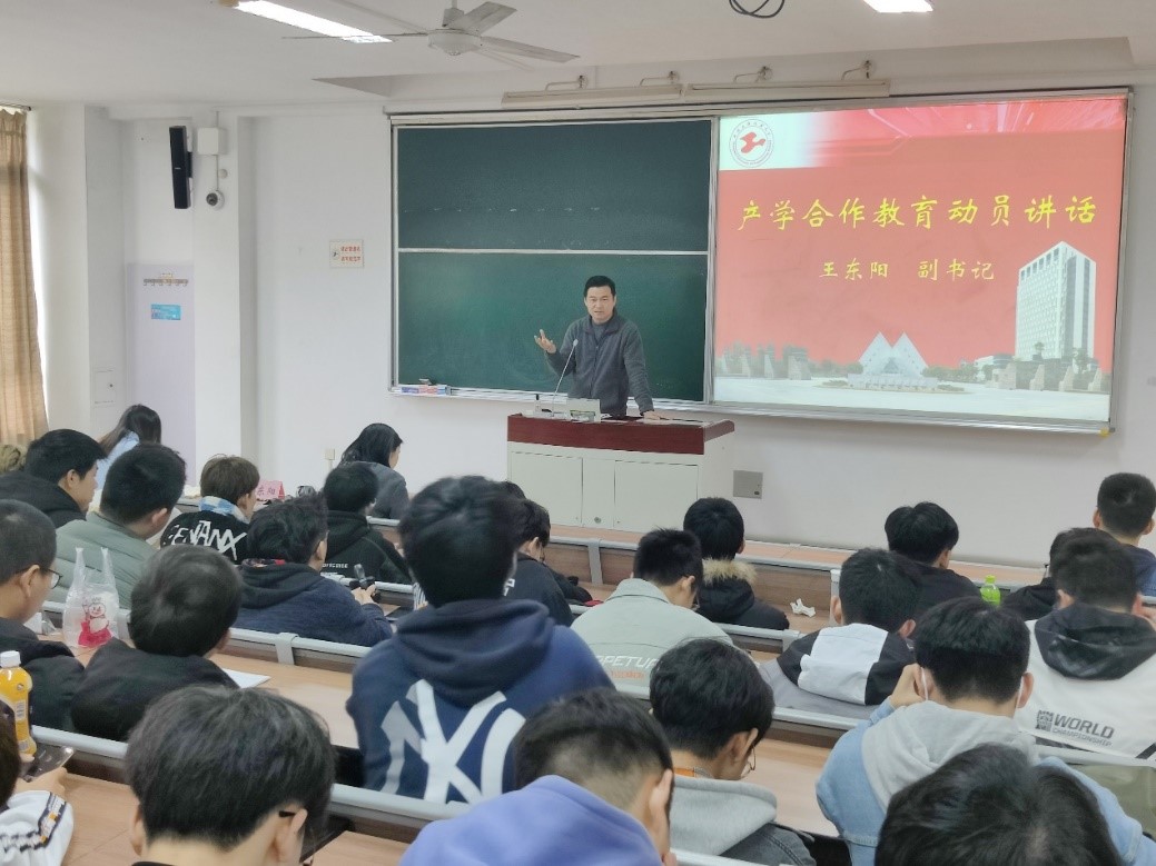 會上,學院黨委副書記王東陽做動員講話,他向同學們介紹了學校產學合作教育30多年的發展歷程、辦學特色,并指出產學合作教育是學生預就業工程的重要組成部分。他希望同學們珍惜產學合作教育機會,努力將所學運用到實踐中,通過產學合作教育進入企業、進入社會,從而主動提升能力,明確發展方向,轉變就業觀念,爭取素質提升。