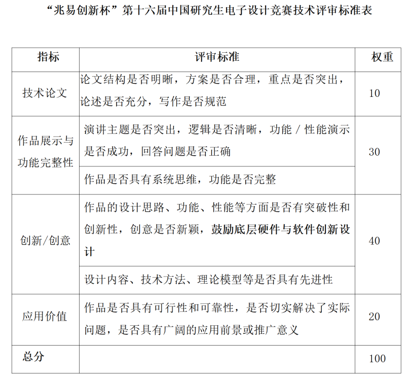 8.初賽和總決賽的評審標準一致。技術競賽從選題的創意創新與先進性、應用價值、功能完整性與作品展示、論文(現場賽)等維度對作品進行評審;商業計劃書專項賽從作品屬性、市場屬性、介入性和答辯表現(決賽時)等維度對作品進行評審。以 100 分制進行打分,給出各參賽作品分數,根據作品分數和獲獎比例得出獲獎結果,參考評分標準如下。