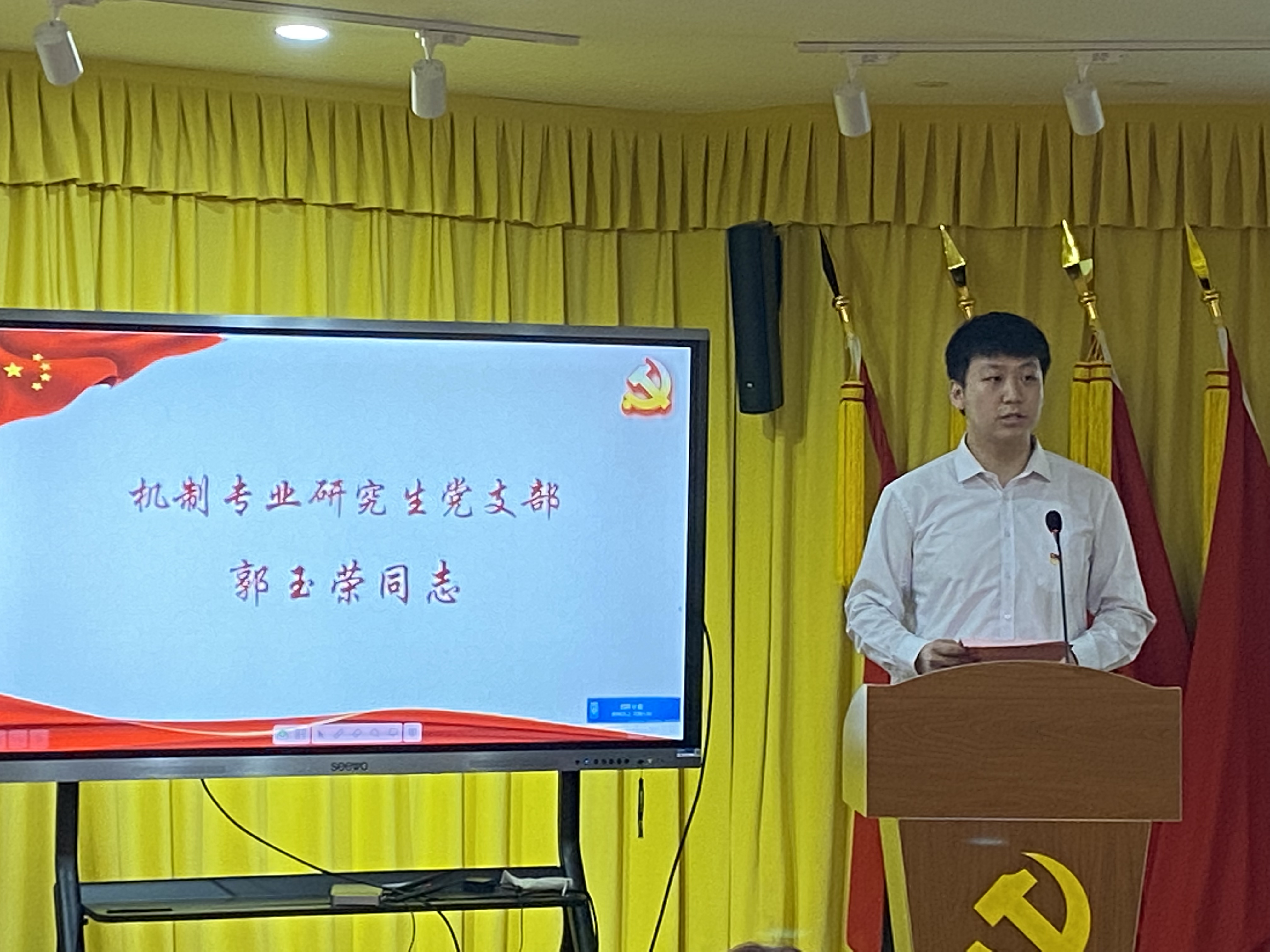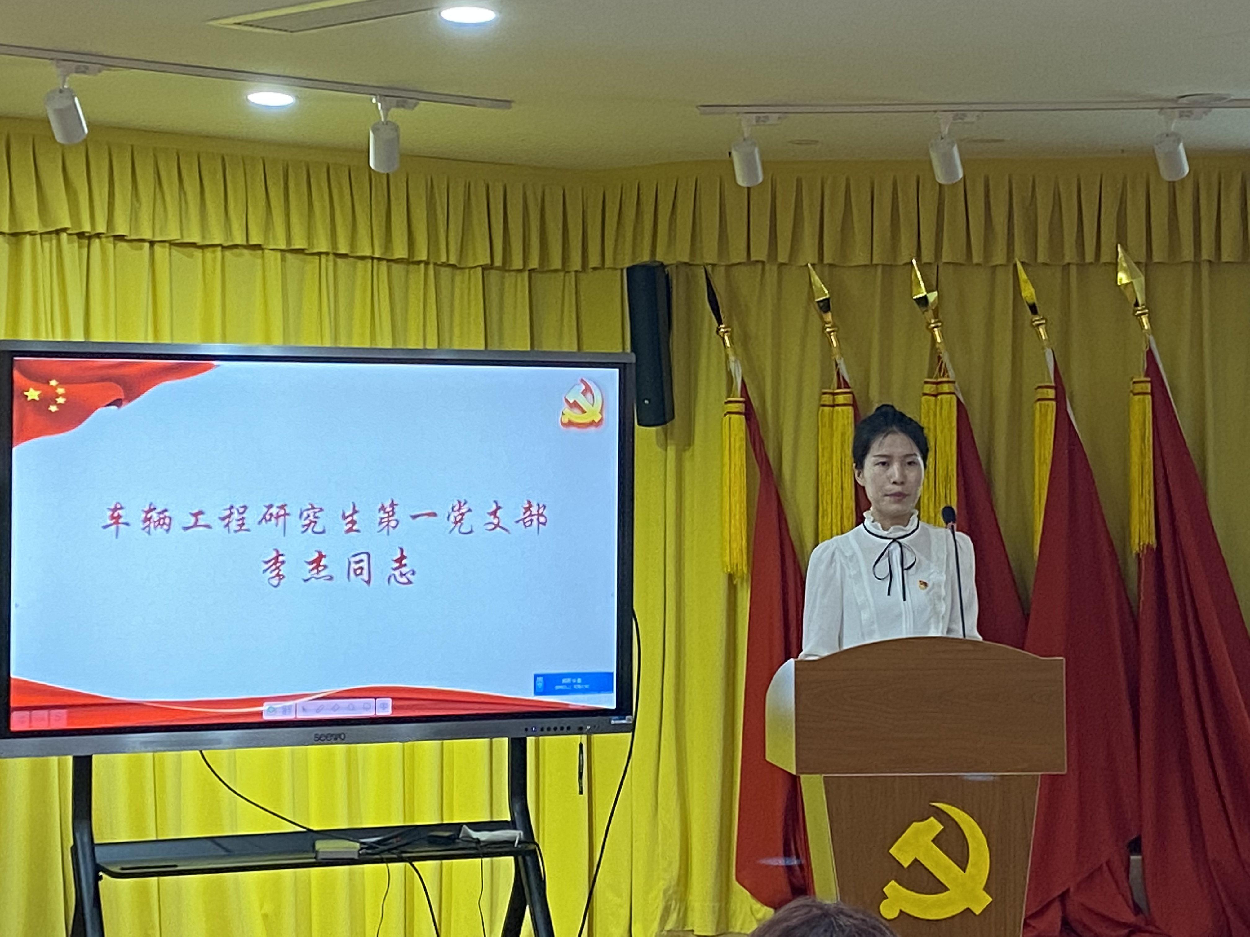 踐行使命擔當,激揚青春力量。機電專業研究生黨支部書記陶翰中作為畢業生代表發言,他以“知行合一,貢獻青年力量”為題,講述青年一代要在實踐中接受檢驗,在擔當作為中得到體現,表示在今后將繼續牢記黨員身份,用行動去踐行入黨誓言。來自機制專業研究生黨支部的郭玉榮和車輛工程研究生第一黨支部的李杰,作為研究生標兵代表,鼓勵新時代青年要用釘釘子的精神,敢于追夢,不忘初心使命,砥礪前行。