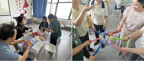 在專業教師的悉心指導下,老師們有序地投入制作。裝艾草入袋、嵌入木柄、纏繞裝飾繩,每一步都體現了匠心獨運。在纏繞木柄的過程中,老師們相互交流技藝,有人因繩結松散而歡笑,有人分享纏繞的省力技巧,現場洋溢著歡聲笑語。盡管成品不如機器制作的整齊劃一,但手工的溫度和老師們獨特的創意,使得每一件作品都成為了不可復制的“匠心之作”。