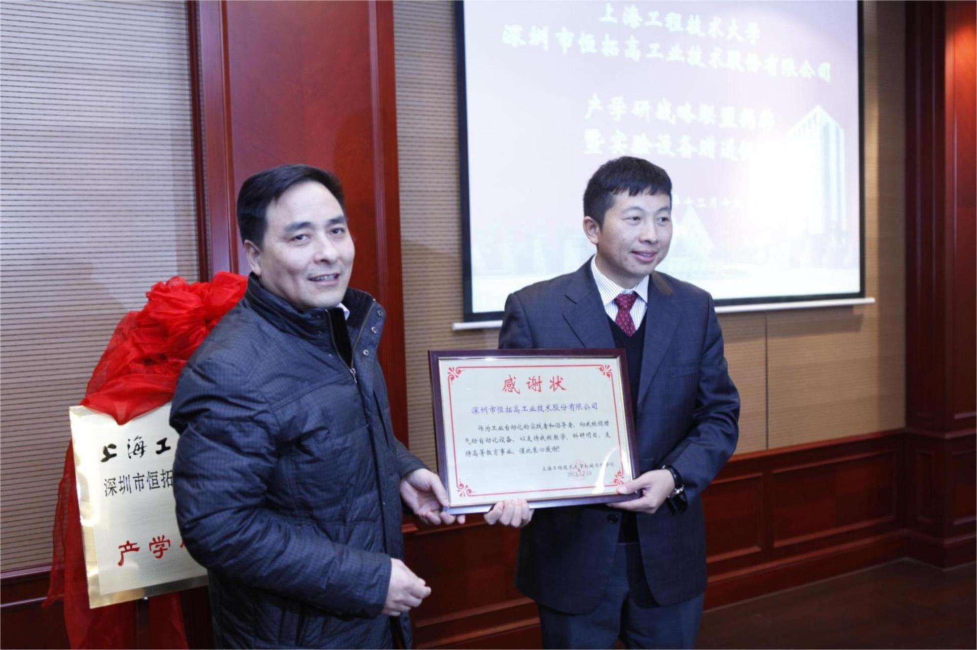 12月19日下午,在上海工程技術大學行政樓406舉行了深圳市恒拓高工業技術有限公司與我校締結產學研戰略聯盟暨設備贈送儀式。上海工程技術大學副校長史健勇、原上海工程技術大學黨委書記兼校長徐子成、機械工程學院院長程武山、院黨委書記虞蓉、學院副院長張敏良、學院黨委副書記梅元媛、深圳市恒拓高工業技術有限公司謝衛華教授、總經辦經理王真立、上海分公司經理秦海龍以及上海工程技術大學曹永上教授、陸棟煒先生共同參與了此次揭牌儀式。