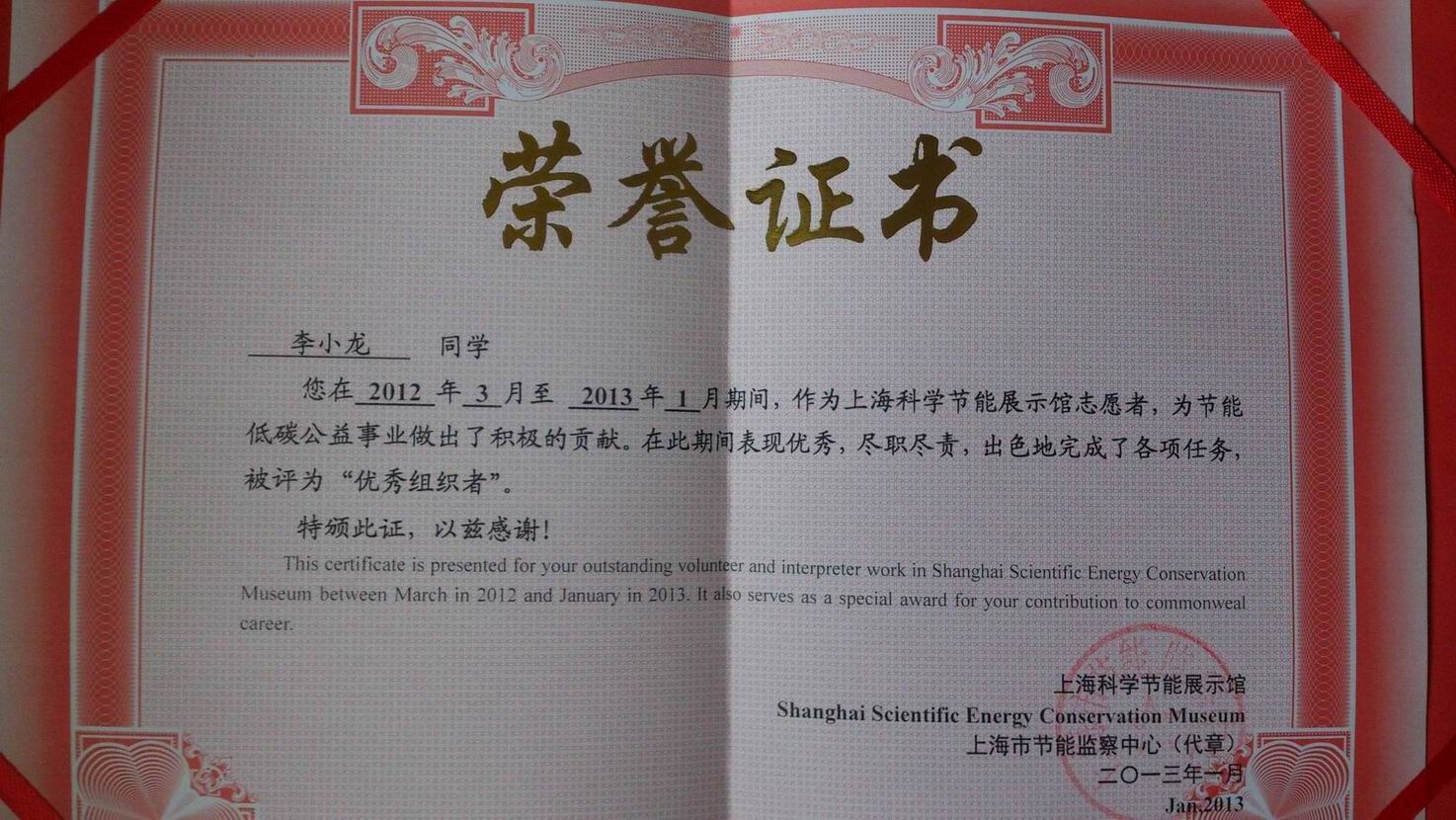 此外,學院李小龍同學被評為2012年度上海市節能館志愿者優秀組織者,展現了當代大學生樂于奉獻自我,服務社會,服務人民的志愿者精神,也表現出了學生志愿者無私貢獻、傳遞愛心、傳播文明、力爭為市民創建更好的社會氛圍的優良風貌。