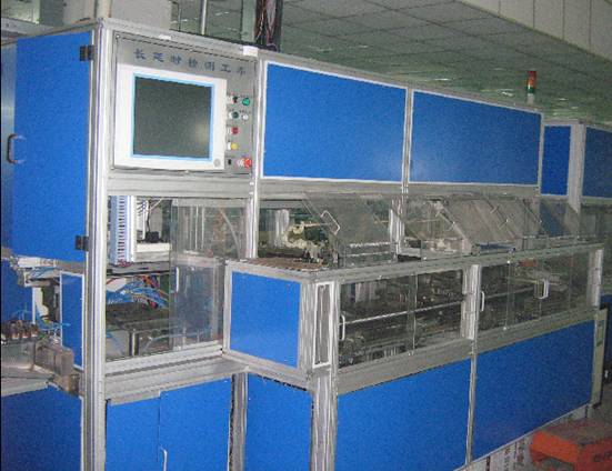 長延時測試臺用于測量斷路器的長延時特性。測試臺通過翻轉機構把從檢測流水線前端輸入的臥式的斷路器由臥式改為立式,然后通過由絲杠帶動的機械手抓取到檢測位置進行裝夾、檢測;檢測中,測試電流源輸出大電流作用于測試件的B相,一體化螺釘螺母調節鎖緊裝置的前一個部分在通測試電過程中跟蹤并調節觸頭的螺釘達到合理高度(保證斷路器在未來使用時,過載情況下可以因安置觸頭螺釘的雙金屬片受熱變形而帶動觸頭觸發斷路器跳閘),然后擰死螺母保證螺釘高度的穩定性;第二個部分再根據B相測試數據來調整A、B相觸頭螺釘高度和擰緊各自的螺母。