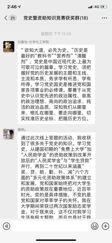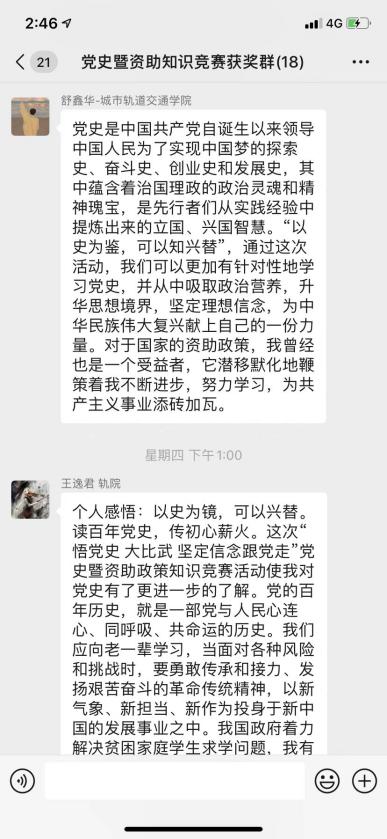 參賽學生表示,通過參加此次知識競賽,不僅督促自己學習黨史知識,同時加深了對國家資助政策的了解和認識。通過資助政策的學習,學生能夠真切感受到黨和國家對大學生的關懷和呵護,并紛紛寫下自己的獲獎感言。化學化工學院的白文婷同學在獲獎感言中談到:“近百年時光,資助政策不斷完善革新,變的是具體措施,不變的是黨和國家對莘莘學子的關懷。我在大學期間榮獲過兩次國家勵志獎學金,對于我來說,這不僅對我學習生活有極大幫助,而且也是對于我在學習熱情上的莫大激勵和鼓舞”。城市軌道交通學院的獲獎同學王逸君在獲獎感言中寫到:“黨和國家著力解決貧困家庭學生求學問題,我的身邊有很多同學曾獲得過國家勵志獎學金,這一定程度上減輕了他們上學的經濟壓力,也讓我們感受到了黨和國家的關懷,感受到了社會主義制度的優越性,激發了我們的社會責任感。”