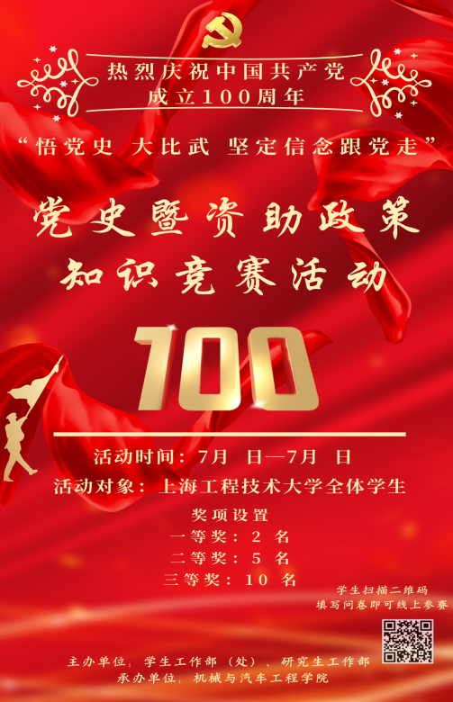 為慶祝建黨100周年,重溫中國共產黨光輝歷史,激發同學們的愛黨愛國熱情和時代責任感,鞏固深化“四史”學習主題教育成果,讓國家資助政策深入人心,激勵受助學生志存高遠,勇于拼搏,感恩奉獻的精神,由學生工作部(處)、研究生工作部主辦,機械與汽車工程學院承辦的“悟黨史 大比武 堅定信念跟黨走”黨史暨資助政策知識競賽活動圓滿落幕。