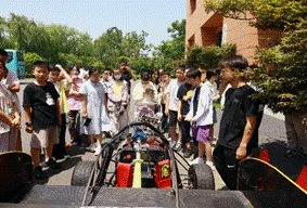 浙江省舟山市嵊泗縣教育局組織的中學生科創夏令營成員訪問大學生汽車科創基地,志愿者以科創成果為核心展開科普,解讀賽車知識。面對孩子們的好奇追問,志愿者們分享調試趣事。模擬駕駛區的體驗,讓孩子們在操控虛擬賽車中感受科技樂趣。