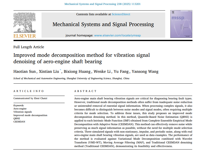 近日,機械與汽車工程學院劉新田教授指導研究生孫浩天在中科院一區期刊《Mechanical Systems and Signal Processing》(2025,IF=8.9)上發表了題為“Improved mode decomposition method for vibration signal denoising of aero-engine shaft bearing”的研究論文。