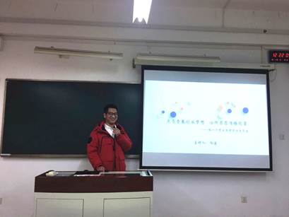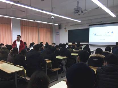 1月15日,機械與汽車工程學院2013級校友向建在教學樓B215開展創業經驗分享的講座。學院黨委副書記王東陽、輔導員汪文婷、王淼出席。