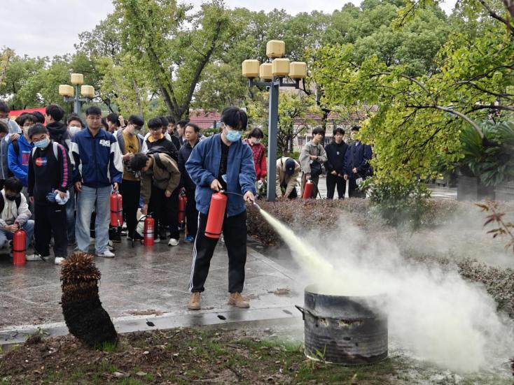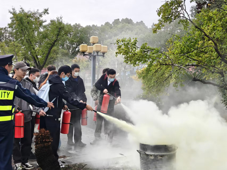 疏散演練結束后,隨即開展滅火技能培訓。吳挺現場講授演示了干粉滅火器“提、拔、握、壓”的核心操作要領和操作注意事項,并通過現場模擬起火點進行滅火示范研究生們分組輪流進行滅火實操訓練確保每位參與者都能熟練掌握滅火技巧