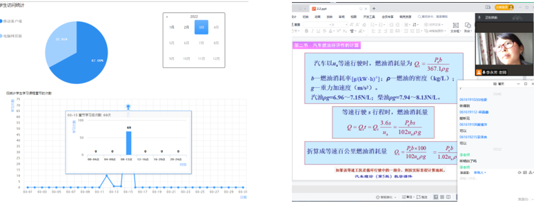 團隊李永芳老師在《汽車理論》云端課程中,采用學習通錄播回看與討論區討論及作業提交、結合騰訊課堂直播、QQ群在線討論等方式使得教學順利進行。在學習通上,安排一定課程內容,讓學生在規定課程時間實施線上自主學習,這很好的鍛煉了學生自主學習的能力,同時學習通上也方便老師及時查看學生學習進度,作業完成提交及測驗等。通過騰訊課堂直播,可以很好的開展翻轉課堂,讓學生現場作答或討論,提高學生學習的積極性。讓學生充分融入學習通自主學習和騰訊直播互動學習,合理安排時間,積極主動思考,從而調動學生的學習積極性,提高教學效果。