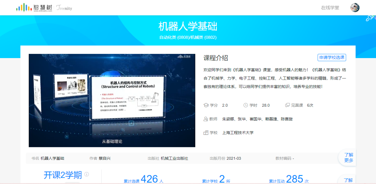 通過課程團隊5位老師歷經2年的打造,上海工程技術大學《機器人學基礎》慕課課程成功在智慧樹平臺上線,成為本次“在線教學云課堂”的有效教學載體。