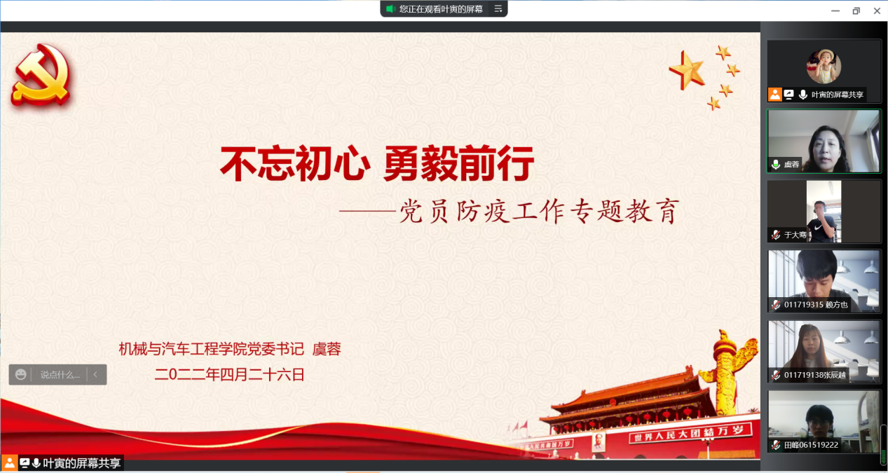 為切實發揮廣大黨員在疫情防控工作中的重要作用,積極引導黨員正確認識疫情形勢,帶頭落實落細各項疫情防控舉措,4月26日下午,機械與汽車工程學院黨委線上舉行學生黨員防疫工作專題教育活動。學院黨委書記虞蓉、學院組織員、學生支部書記、學生黨員近280人參加會議。
