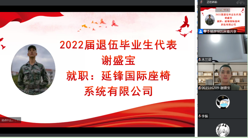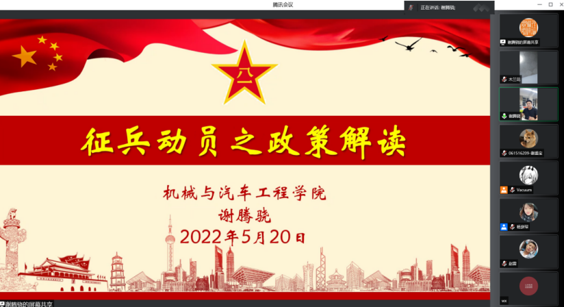 隨后,針對學院本屆畢業生中有入伍意愿的學生和家長,圍繞“軍營淬火鍛造文武雙全 有志青年領航未來風帆”主題,學院武裝工作負責人謝騰驍老師就征兵入伍的相關政策、報名要求、入伍流程進行解讀分享,鼓勵畢業生們攜筆從軍保家衛國,在軍旅中實現人生夢想,建功立業。