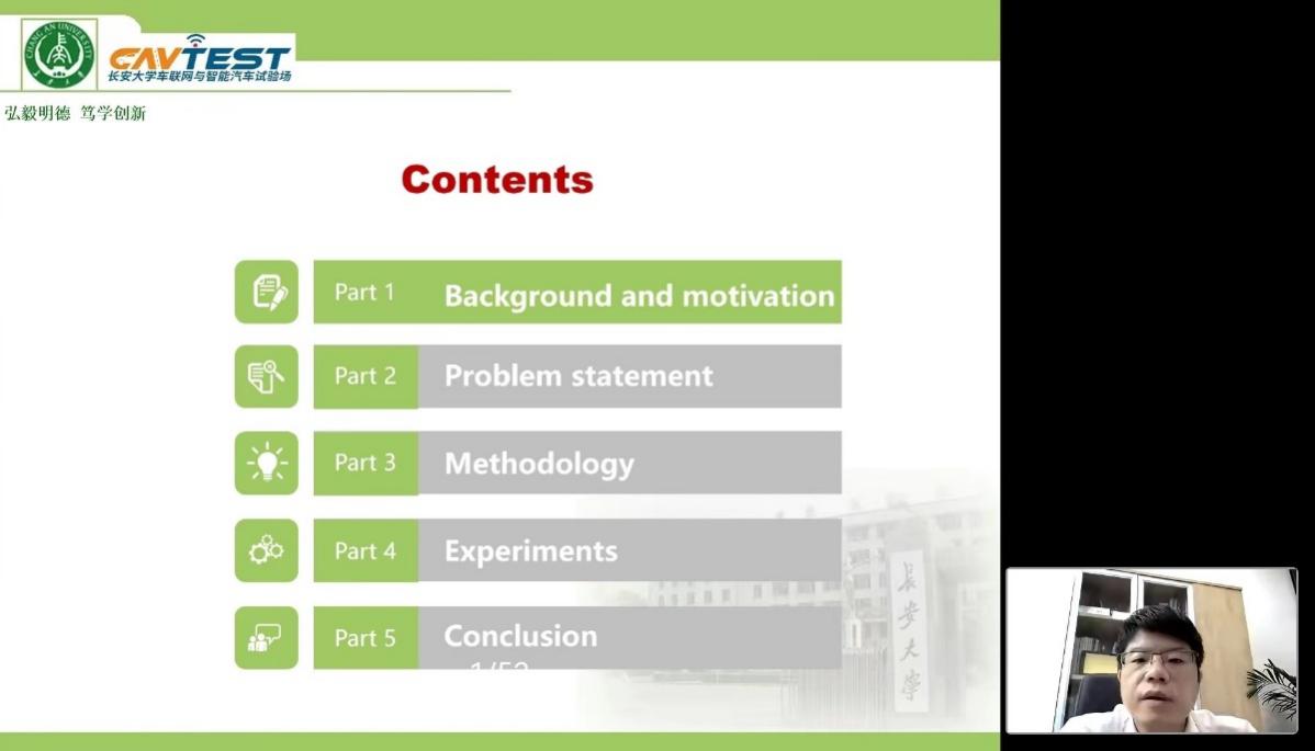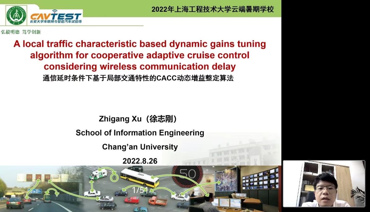 2022年8月26日14:00-16:00,通過華為云會議視頻平臺,長安大學信息工程學院副院長、教授徐志剛為暑期學校做題為《A local traffic characteristic based dynamic gains tuning algorithm for cooperative adaptive cruise control considering wireless communication delay》的線上專題講座。講座由機械與汽車工程學院副院長郭輝教授主持。