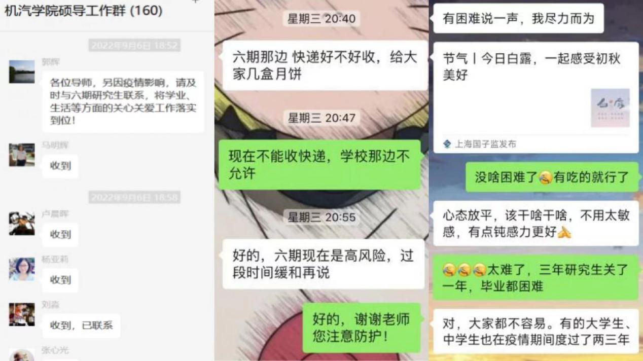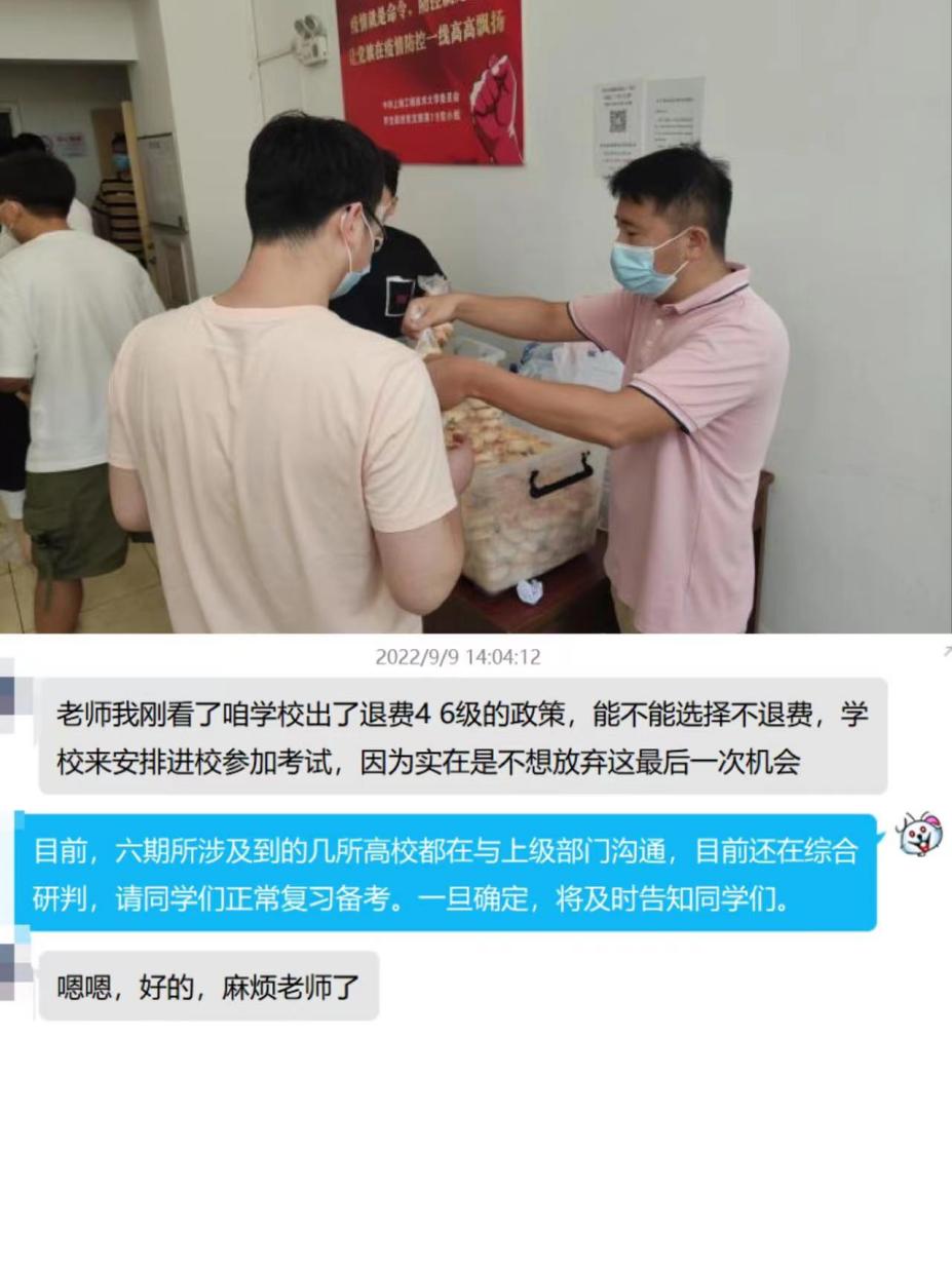 據悉,學院黨政根據六期學生的實際需求和困難,第一時間組成學院領導、輔導員、住樓輔導員、學生骨干的保障小組,迅速調集人力、物力,協調劃撥經費為學生采購急需的生活日用品和食品,聯系后勤車輛及時把慰問物資送到學生手中,切實解決了同學們的燃眉之急,讓同學們體會到了學院的關愛和溫暖。在六期列為高風險當天,學院選派一名骨干輔導員駐守六期宿舍,與學生同吃同住,第一時間現場處置學生遇到的各類問題,及時疏導和安撫學生心理,為學生提供24小時全天候貼心服務。學院積極組織所有導師主動電話或信息關心帶教學生,加強對學生的關心關愛,鼓勵并指導學生繼續做好科研工作,云端話學術,科研不停步。