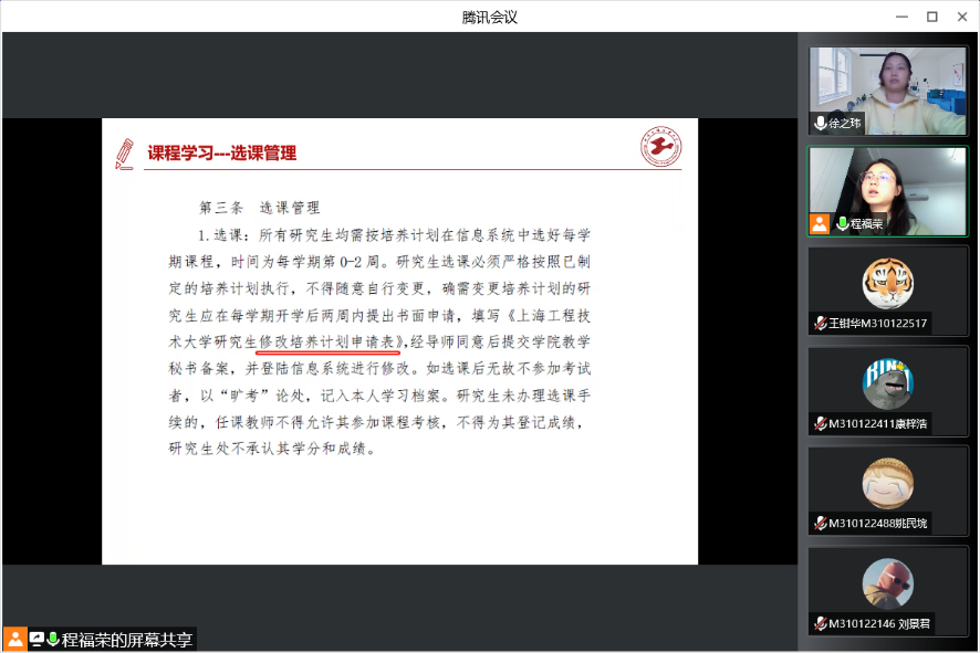 全體新生圍繞《上海工程技術大學學籍學歷管理工作實施細則》、《上海工程技術大學研究生管理規定》、《上海工程技術大學研究生違紀處分管理辦法》、《上海工程技術大學關于各類考核考場規章、違規界定和處分管理規定》等14個研究生培養管理制度文件進行專題學習。學習中,程福榮老師強調各位研究生同學要嚴格遵守校規校紀、落實好學風建設相關要求,防微杜漸,堅決杜絕學術不端。要秉承“內化于心、外化于行”的基本原則,嚴格自我要求,建設良好學風,做帶頭遵守校規校紀的模范。