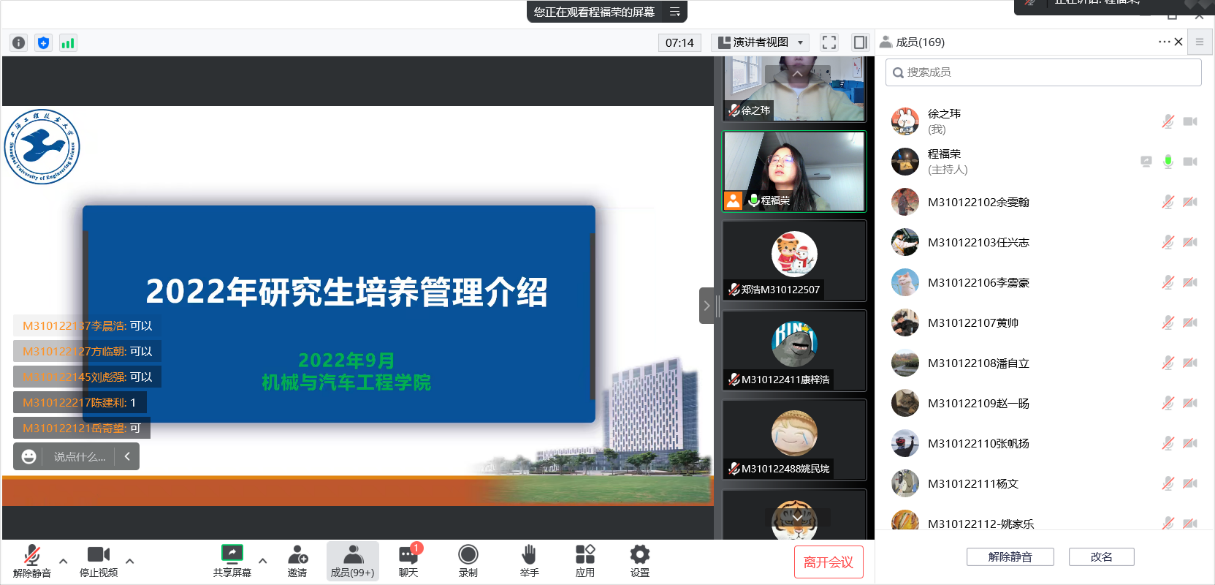 新生入學教育是是高校落實立德樹人根本任務的重要環節。根據學校工作要求,切實做好2022級研究生新生入學教育,進一步落地落實落細研究生培養管理相關規章制度,增強研究生自我教育、自我管理和自我服務的能力,機械與汽車工程學院于2022年10月9日線上組織開展了2022級研究生培養管理制度學習專題會議。學院研究生秘書程福榮、徐之瑋主持了會議,2022級全體研究生參加了此次會議。