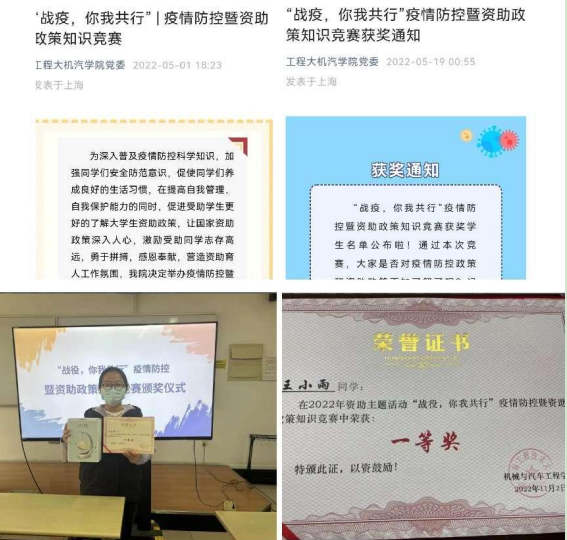 疫情期間,學院將資助政策宣傳與疫情防控宣傳并重并舉,以育人為著力點開展《“戰疫、你我共行”疫情防控暨資助政策知識競賽》,在推動貫徹疫情防控政策的同時,讓防疫知識與國家資助政策深入人心,以賽促學,以學促行。學院為獲獎學生頒發證書及獎品,激勵受助學生積極向上,在國家及學校的大力資助下,從自我解困逐步邁向成長成才。