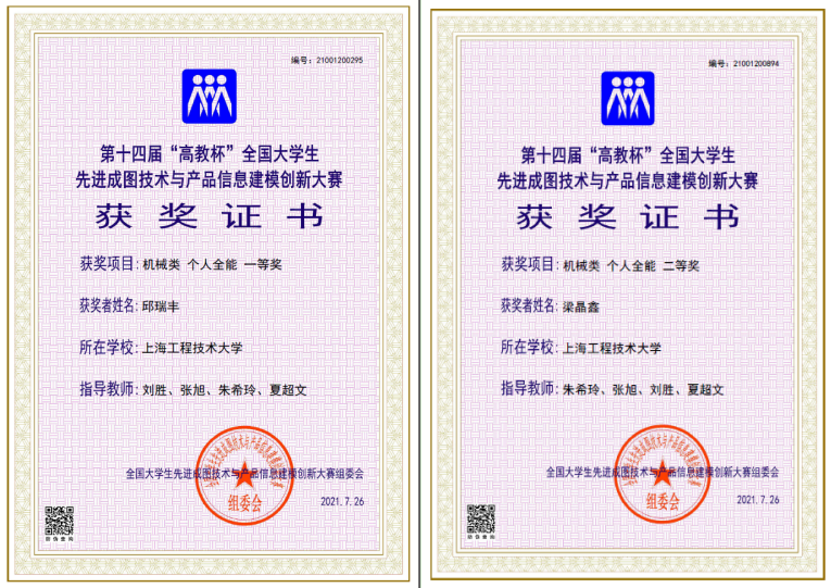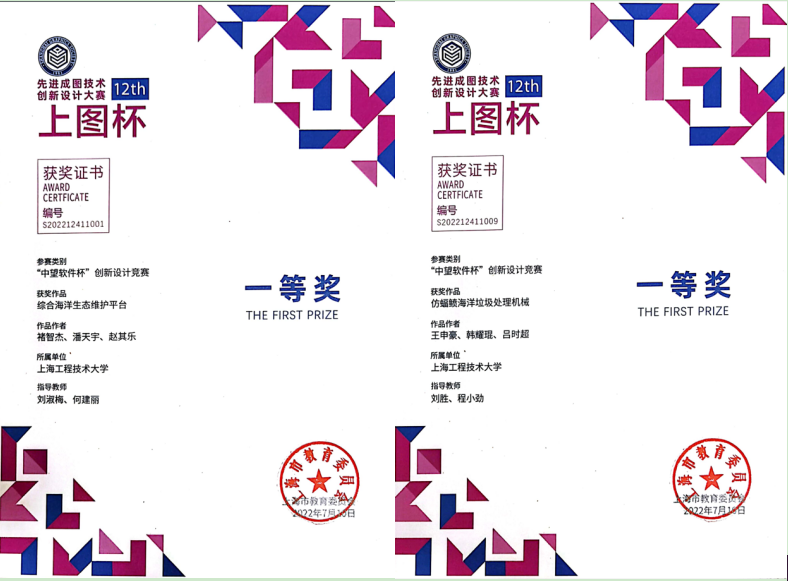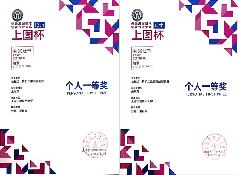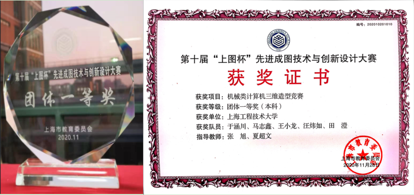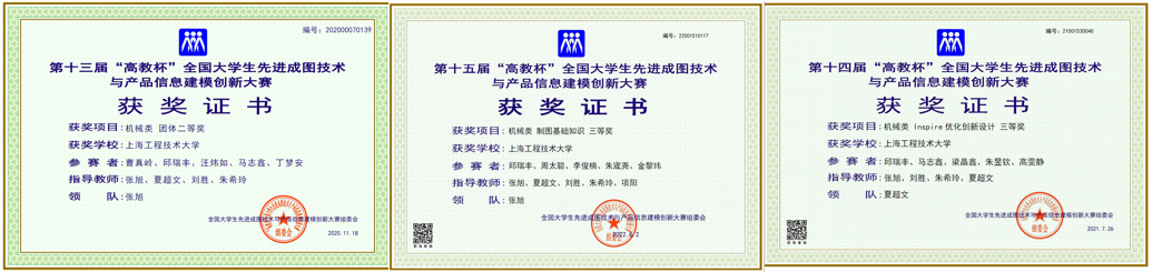 通過組織“上圖杯”競賽的前期培訓、選拔,每年遴選出多只二維團隊、三維團隊和創新團隊,涉及涵蓋100多人次參加競賽,指導老師9人。參加包括機械類二維、三維建模競賽,創新設計大賽三個類別的比賽,每年獲得上海市團體獎10多項,個人獎20多項。其中代表性的獎項如下: