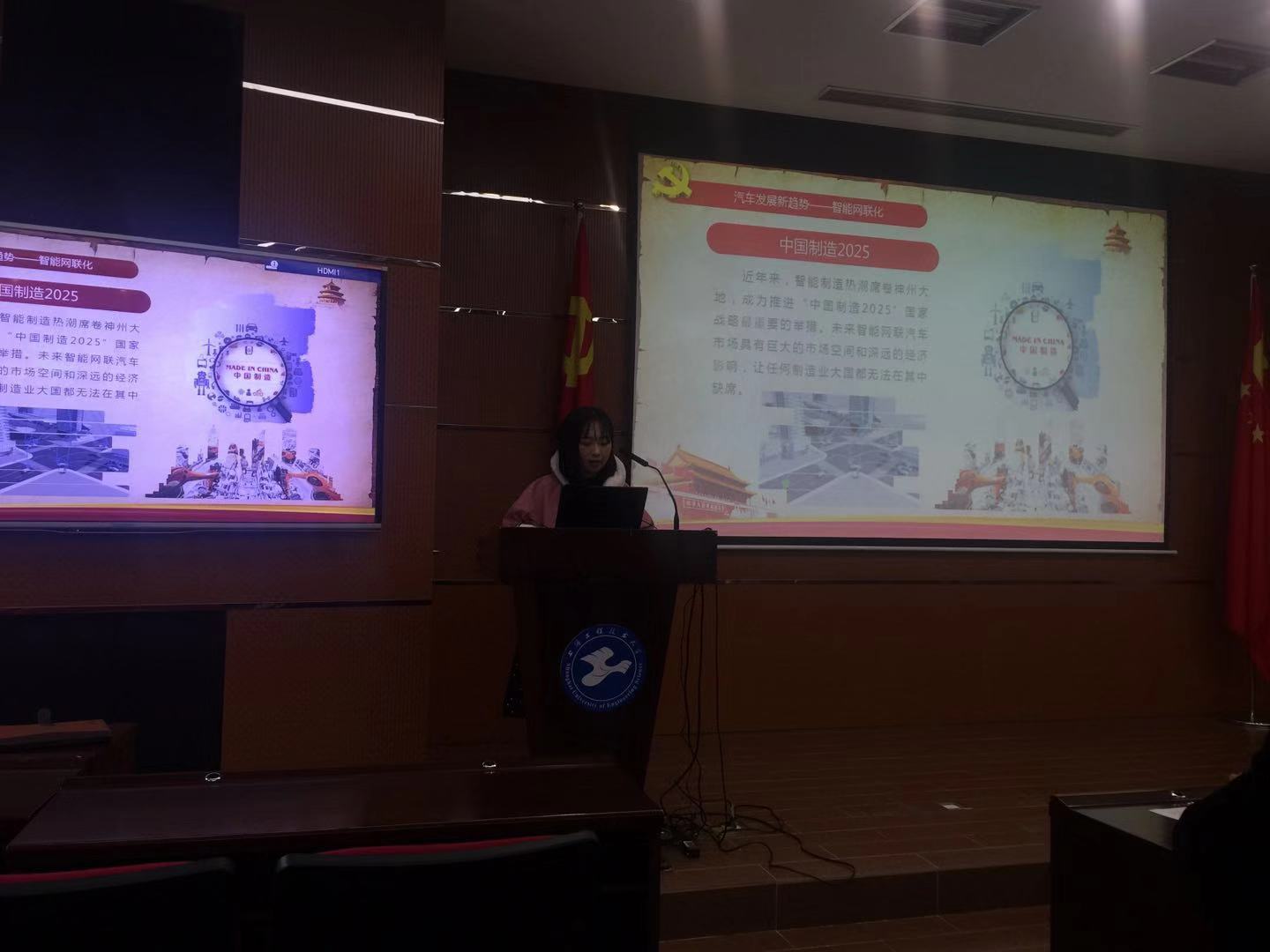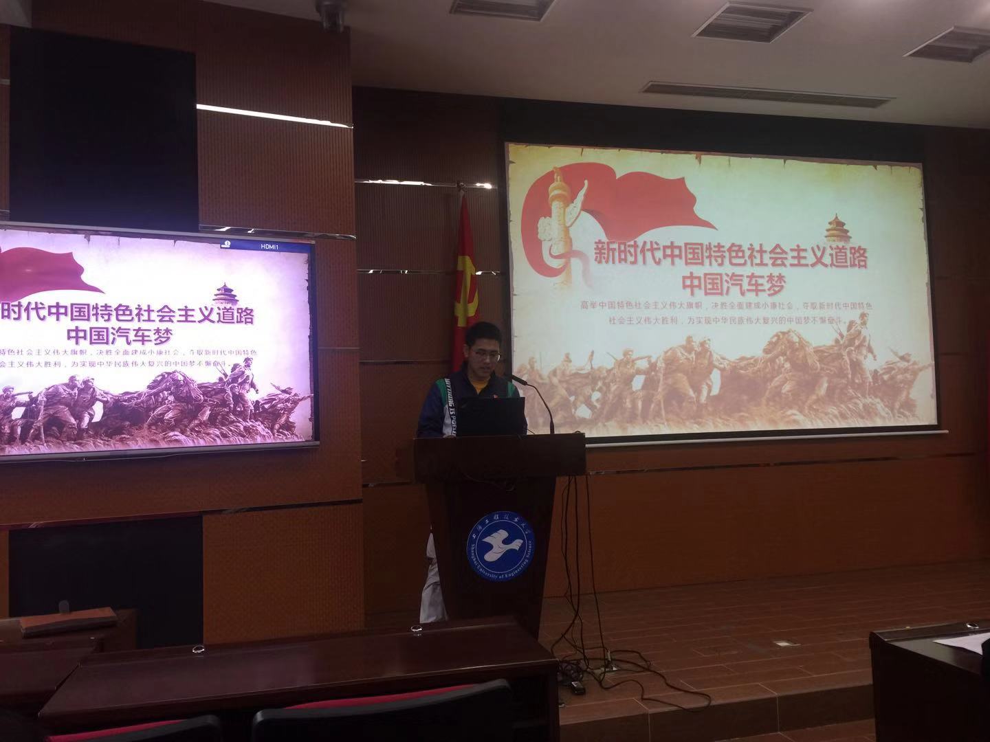 接下研究生王凱和馮倩倩帶來“新時代中國特色社會主義道路中國汽車夢”黨課內容,他們從改革開放看中國汽車的發展、社會主義新時代下汽車發展的新四化兩個方面講述了中國汽車業的發展歷程,同時向我們發出了《新時代,新趨勢,學生黨員在行動》的響亮口號。