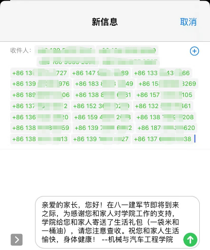 本次擁軍優屬活動為服役學生家庭送上了大米等生活必需品,代表著全院師生的一份心意,為軍屬帶去一份安心和溫馨。此外,學院通過短信向軍屬致以誠摯的問候,簡短的文字承載著學院師生的擁軍情,表達了對軍人家庭幸福平安的美好祝愿。