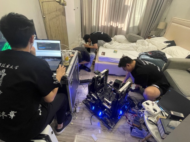比賽過程中,全隊上下齊心協力、晝夜不停、披星戴月地對機器調試。參賽的師生不顧19個小時綠皮火車的舟車勞頓,一到賓館就開始各種兵種的檢查、調試;為了節約差旅,戰隊的8個姑娘自帶睡袋擠在一個2人間中打地鋪;為了讓機器性能能盡快適應場地參數,隊長深夜帶著大家到友校