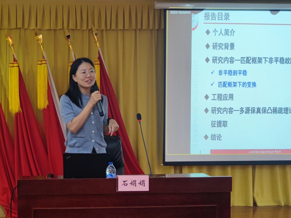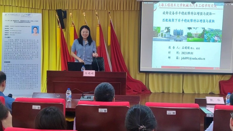 2023年9月1日10:30,在現代交通工程中心8B222,蘇州大學軌道交通學院教授,博士生導師石娟娟為暑期學校做題為《旋轉設備非平穩故障特征增強與提取》的線上線下專題講座。線上通過華為云會議視頻平臺直播,本次講座由機械與汽車工程學院副院長劉新田主持。