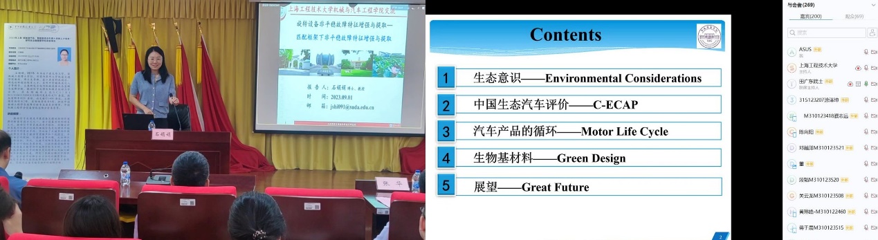 開班典禮結束后,蘇州大學軌道交通學院教授、博士生導師石娟娟,做《旋轉設備非平穩故障特征增強與提取》專題講座。石娟娟教授介紹了機械設備狀態監測與故障診斷研究方向,闡述了機械設備故障診斷研究背景和當前研究熱點。北京建筑大學教授、博士生導師田廣東院士做題為《車輛生態設計現狀分析與進展》的線上專題講座。田廣東院士圍繞我國車輛的設計生產與生態環境的協調進行了介紹,指出了在我國車輛生態向綠色發展和新能源轉型升級背景下的科技創新和產業發展機遇。報告引起與會師生熱議。