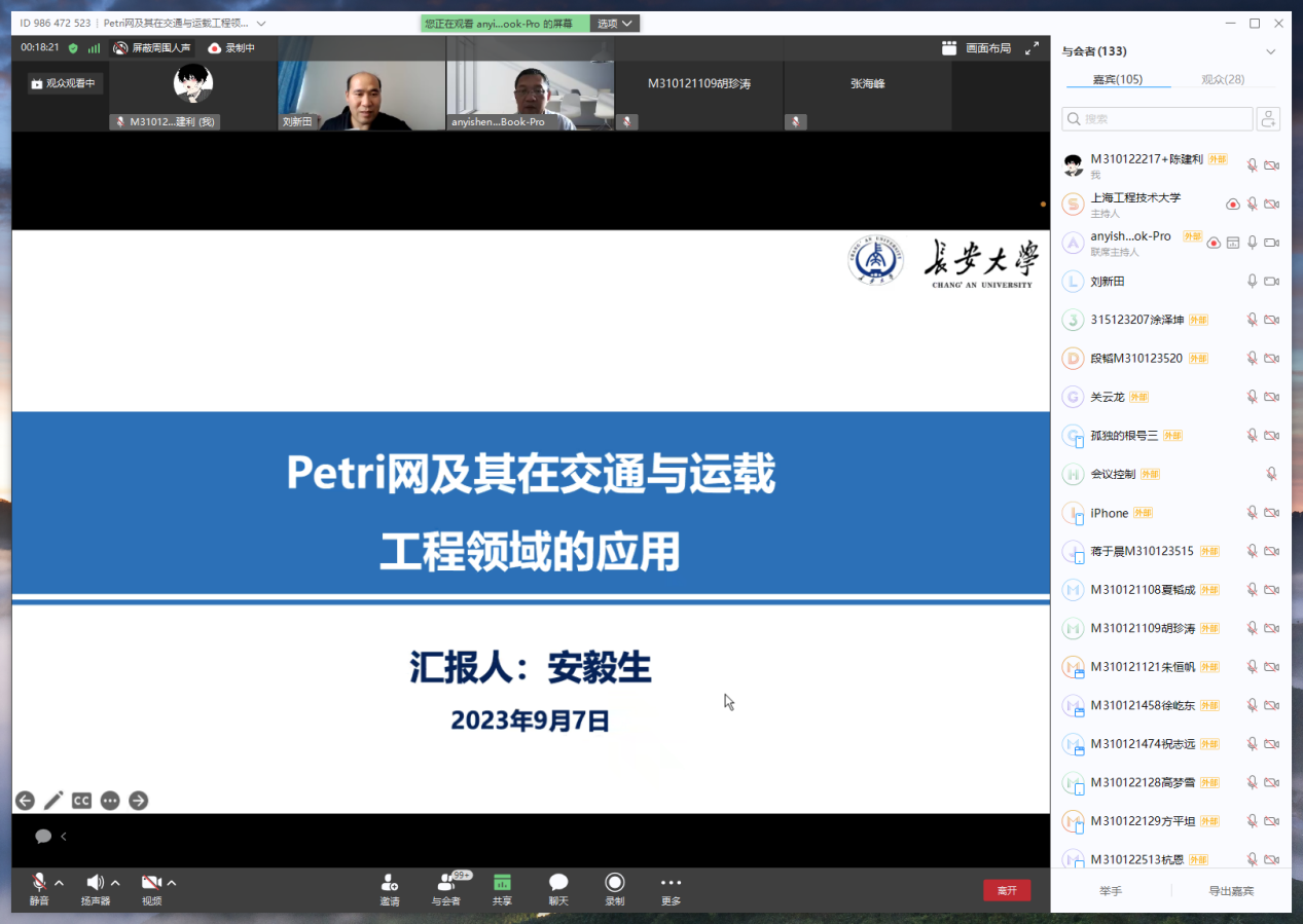 2023年9月7日14:00,通過華為云會議視頻平臺,長安大學博士生導師,信息工程學院院長安毅生教授為暑期學員做題為《Petri網及其在交通與運載工程領域的應用》的線上專題講座。講座由機械與汽車工程學院副院長劉新田教授主持。