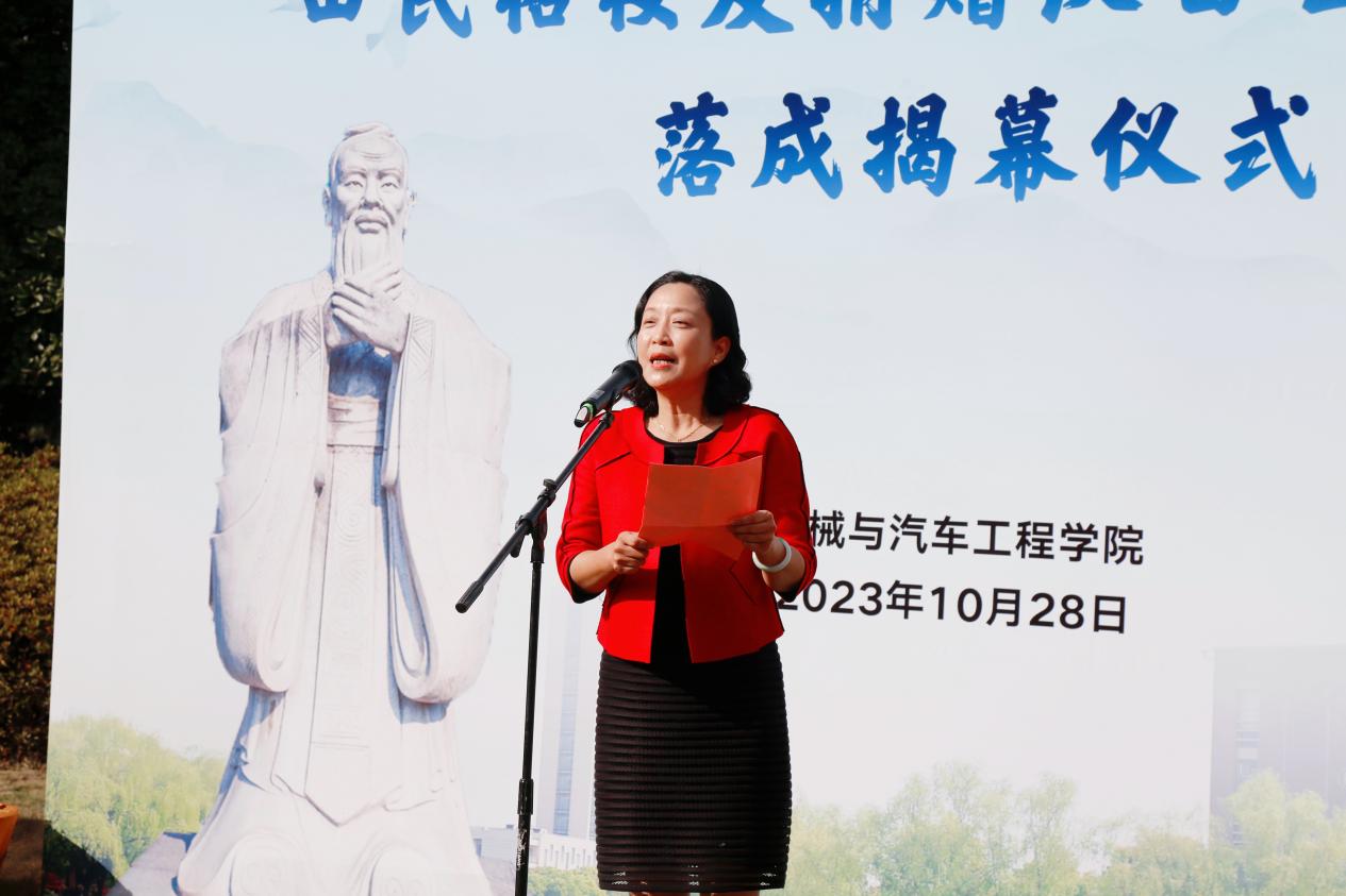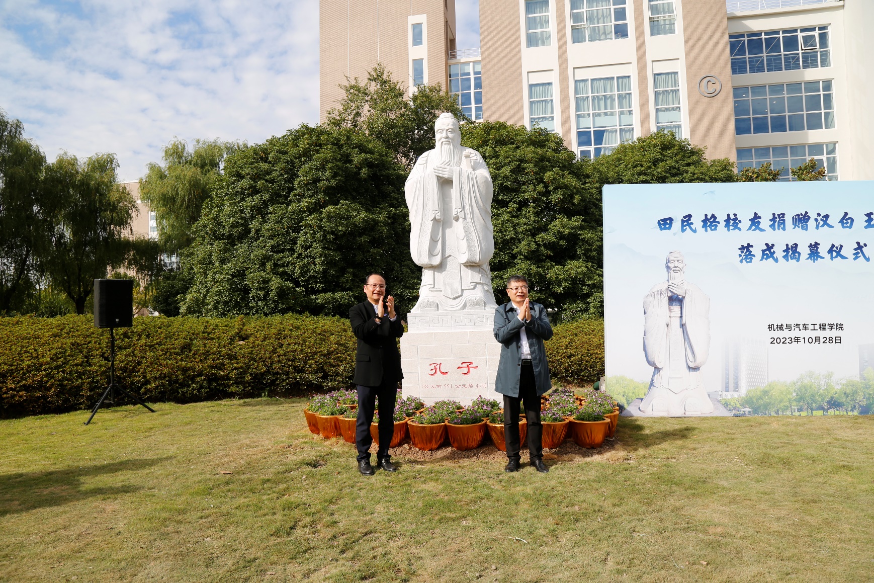 2023年10月28日下午,機械與汽車工程學院“田民格校友捐贈漢白玉孔子像落成揭幕儀式”在教學樓C樓前舉行。校黨委副書記、校長俞濤,校長辦公室主任王佳杰,機械與汽車工程學院黨委書記虞蓉,基建處副處長范祚迅,孔子像捐贈人——山東校友分會會長、欣格瑞(山東)環境科技有限公司董事長田民格,以及機械與汽車工程學院師生代表50余人參加了本次儀式。儀式由機械與汽車工程學院黨委副書記黃中子主持。