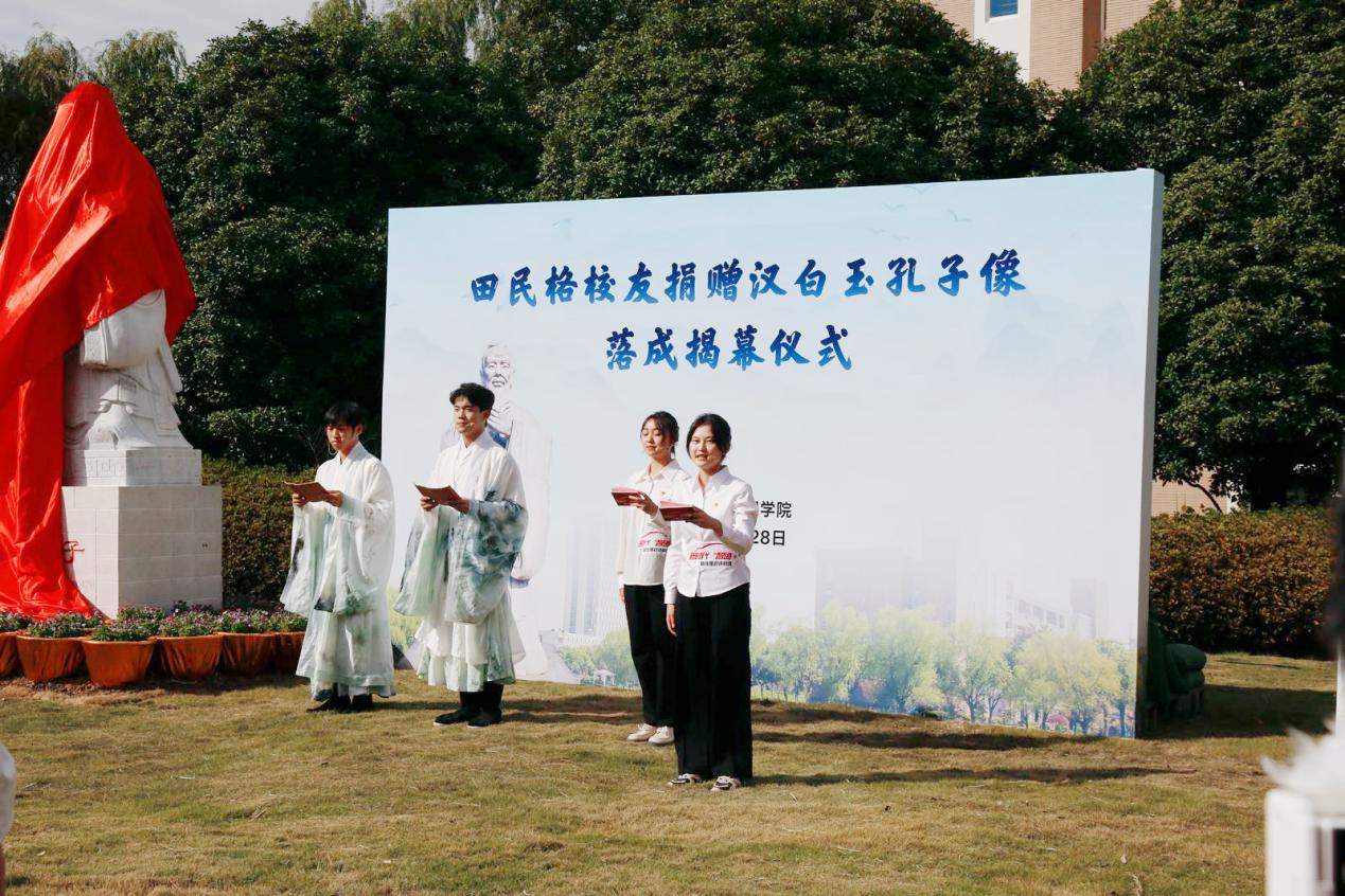儀式上,俞濤校長和田民格校友共同為孔子像揭幕,并與現場師生合影留念。