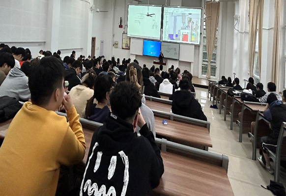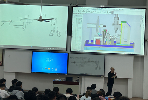 霍韞鈞校友以八工位自動鉚接機為例,從方案設計、材料選擇、零部件選型及設計等方面詳細講解了機電產品的設計過程及所需專業知識,生動展示了機械工程師的職業素養。課堂教學生動活潑,學生互動積極,拓寬了學生對機械工程專業的理解與認識;課后霍韞鈞校友針對學生就業擇業等問題做出細致的解答和建議,使學生們受益匪淺。
