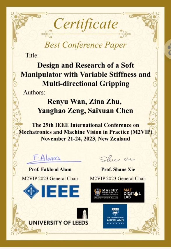上海工程技術大學機械與汽車工程學院智能協作機器人科研團隊的論文“Design and Research of a Manipulator with Variable Stiffness and Multi-directional Gripping”榮獲最佳論文獎,第一作者為碩士研究生萬仁宇,指導老師有朱姿娜、陳賽旋等。