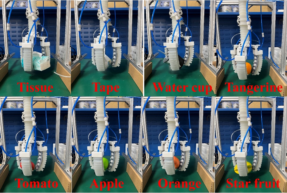 相比剛性抓手,軟體抓手更加靈活、安全、適應性強,在醫療、服務、食品等領域具有廣闊的應用前景。該論文提出了一種新型顆粒阻塞變剛度結構,通過蜂巢狀網格支撐結構將阻塞顆粒分割成若干個區域,有效地減少了手指彎曲過程中顆粒重組造成的形狀不穩定。該抓手不僅能夠實現抓手柔性接觸、剛性抓取,而且采用兩段類似手臂功能的柔性腕,實現了在空間內多向抓取能力。實驗表明,該抓手能夠抓取形狀和質量各異的目標物體,在阻塞氣壓為-50KPa的條件下,阻塞狀態下的剛度能達到自然狀態下剛度的9.8倍;在驅動氣壓30KPa和阻塞氣壓-30KPa的條件下,抓手的抓取質量可達315g,表明了該抓手能夠實現較好的變剛度的能力并滿足對日常果蔬、食品的抓取需求。