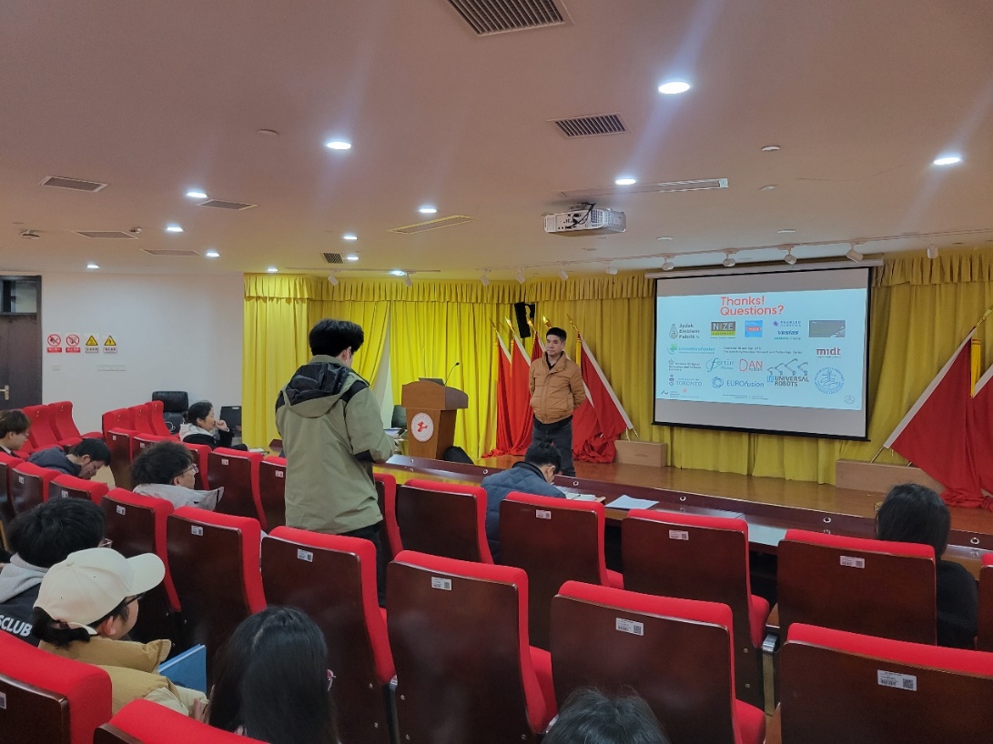 張教授在報告中詳細介紹了其所在課題組進行的最新研究成果。報告涵蓋了多個領域,包括機器人系統的設計建模和控制、機器人操縱控制理論、康復機器人和工業機器人的制造與生產。特別是在協作機器人領域,張教授探討了中小企業生產和制造中的挑戰,并提出了一些解決方案。他指出,協作機器人在提高生產效率、降低成本和改善工作環境方面具有巨大潛力。張教授表示,通過深入研究和合作,中丹兩國可以共同推動協作機器人技術的發展,為雙方企業提供更多的合作機會。報告中另一個重要議題是中丹雙邊研究網絡計劃。張教授介紹了該計劃旨在促進中丹兩國科研機構之間的合作,特別是在機器人領域。他強調了這一倡議為兩國研究人員提供了一個獨特的合作平臺,有望推動機器人技術的創新和發展。 隨后,張教授耐心解答了同學們提出的問題,并與大家展開了深入的交流和討論。整個報告會深深吸引了在場師生的興趣,拓寬了大家的學術視野。張教授與現場師生進行了深入而富有成效的討論。與會者紛紛表示,張教授團隊的研究成果為未來機器人技術的發展描繪了嶄新的藍圖,期盼未來能有更多的交流與深入合作。