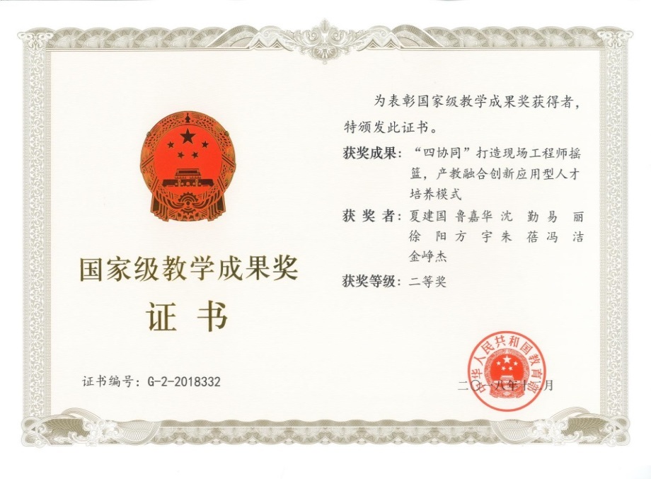 1 | "四協同"打造現場工程師搖籃,產教融合創新應用型人才培養模式 | 國家級教學成果獎二等獎 | 方宇 | 2018 |